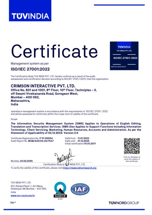 크림슨 인터랙티브(이나고)는 정보보안과 품질관리를 가장 소중히 생각하여 정보보안 관리시스템 ISO/IEC 27001:2022와 품질 관리시스템 ISO 9001:2015 인증을 획득하였습니다. 또한 국제번역서비스표준 ISO 17100:2015 인증도 가지고 있습니다.